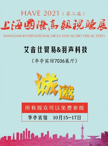 羽声科技诚挚的邀请您于2021年10月15-17日,在上海市徐汇区漕溪北路1200号华庭宾馆7036展厅,莅临艾音仕贸易&羽声科技7036展房,来一场音乐发烧友的狂欢会。