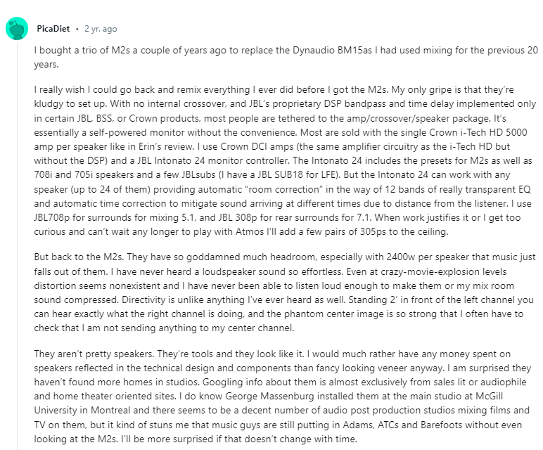 我真的希望我能回去重新混音我在得到 M2 之前所做的一切。 我唯一的抱怨是它们设置起来很笨拙。 由于没有内部分频器,并且 JBL 专有的 DSP 带通和时间延迟仅在某些 JBL、BSS 或 Crown 产品中实现,因此大多数人都受限于放大器/分频器/扬声器套件。 它本质上是一个自供电显示器,但不方便。