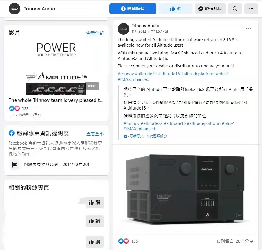 11月30日,Trinnov在社交媒体平台上正式宣布:期待已久的Altitude平台软件更新已发布,新版本号4.2.16.8现已为所有Altitude用户提供。藉由此次更新,Trinnov将IMAX Enhanced和“+4输出声道”功能带到了Altitude 16和Altititude 32中。请联络批发商和经销商进行更新。