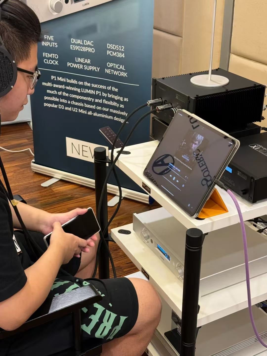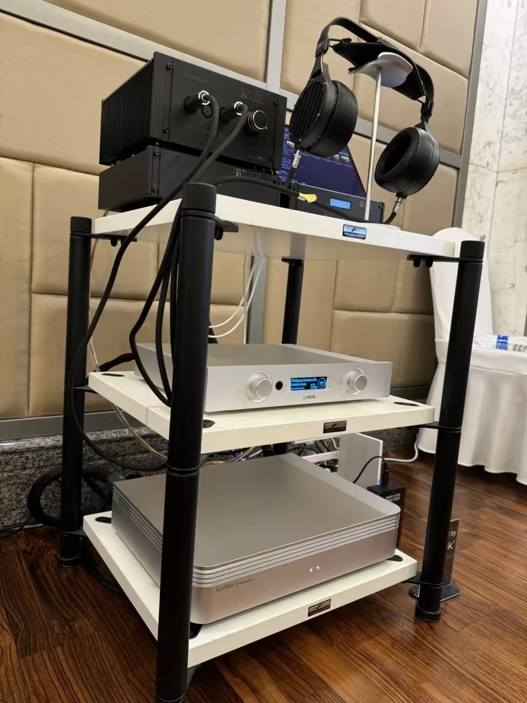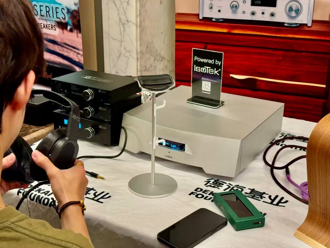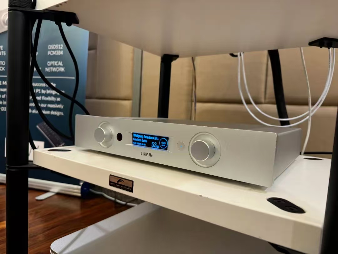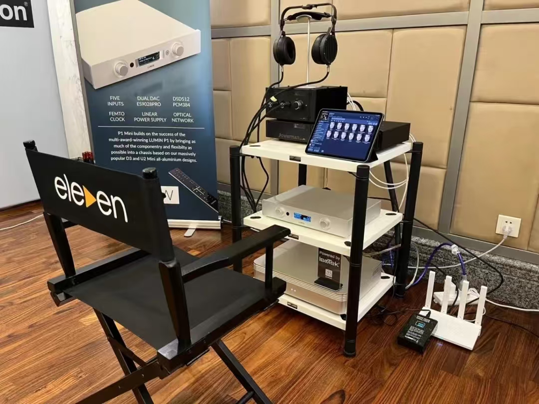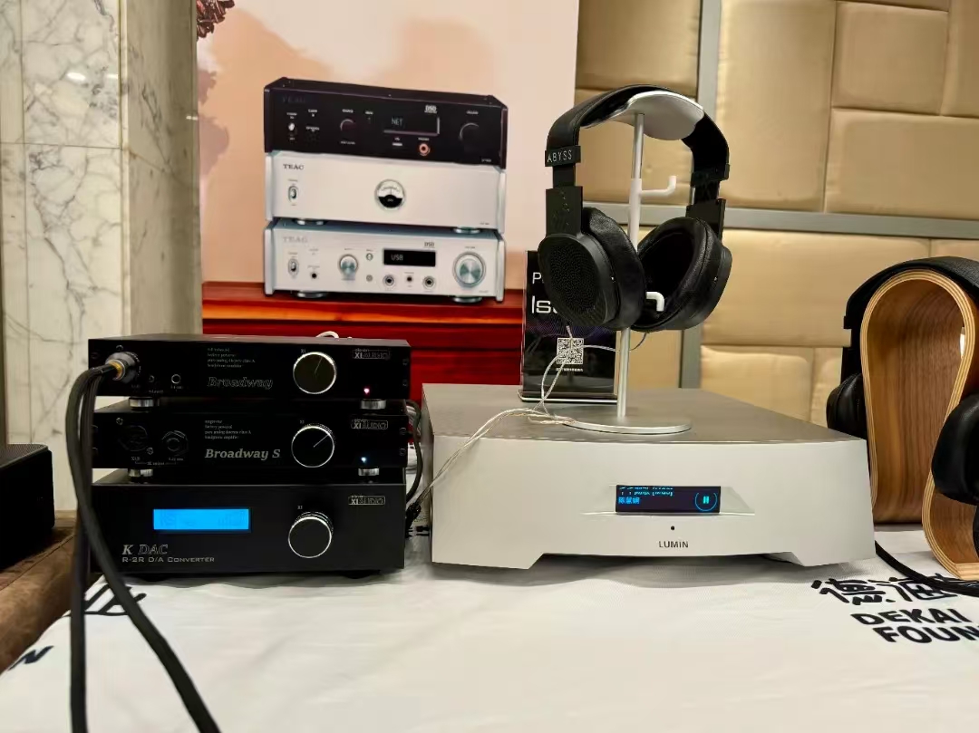 这套系统的耳机部分来自Abyss最新推出的Diana黛安娜系列,这是一个更加年轻时尚的系列,不像Abyss 1266厚重,但是同样拥有Abyss的好声音。配合出声的Xiaudio KDAC解码和Broadway耳放也是相对比较高性价比的产品。JPS Labs的线材部分和Isotek 的 V5 Sirius也是随着高性价比的产品。可是在讯源部分,配上了一台售价将近10万的数播产品Lumin P1旗舰。一下子让整体的售价也逼近了之前一套耳机系统。其实我们希望是任何一套耳机系统在展会上都让参观者获得惊喜。