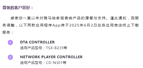 感谢您一直以来对雅马哈家庭音响产品的厚爱与支持。谨此通知,因服务调整,以下两款应用程序App将于2025年6月2日在各应用商店终止下载服务: