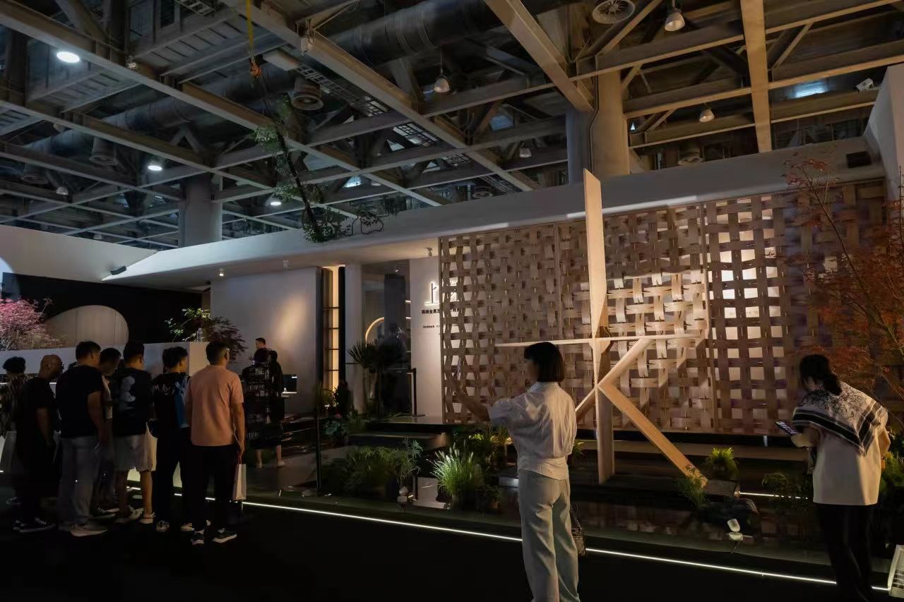 “上物”主题馆入口处,深色镜面拟造“静”态下的湖面,荷叶青石相映成趣,展现出一幅恬静宜人的画卷。