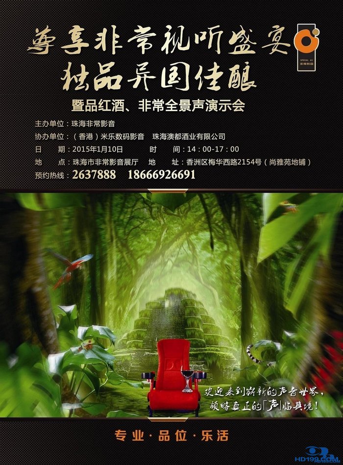 由珠海非常影音主办,米乐数码影音、珠海澳都酒业有限公司协办的“乐享美酒.非常全景声演示会”将于2015年1月10日14:00~17:00在珠海非常影音展厅举行。