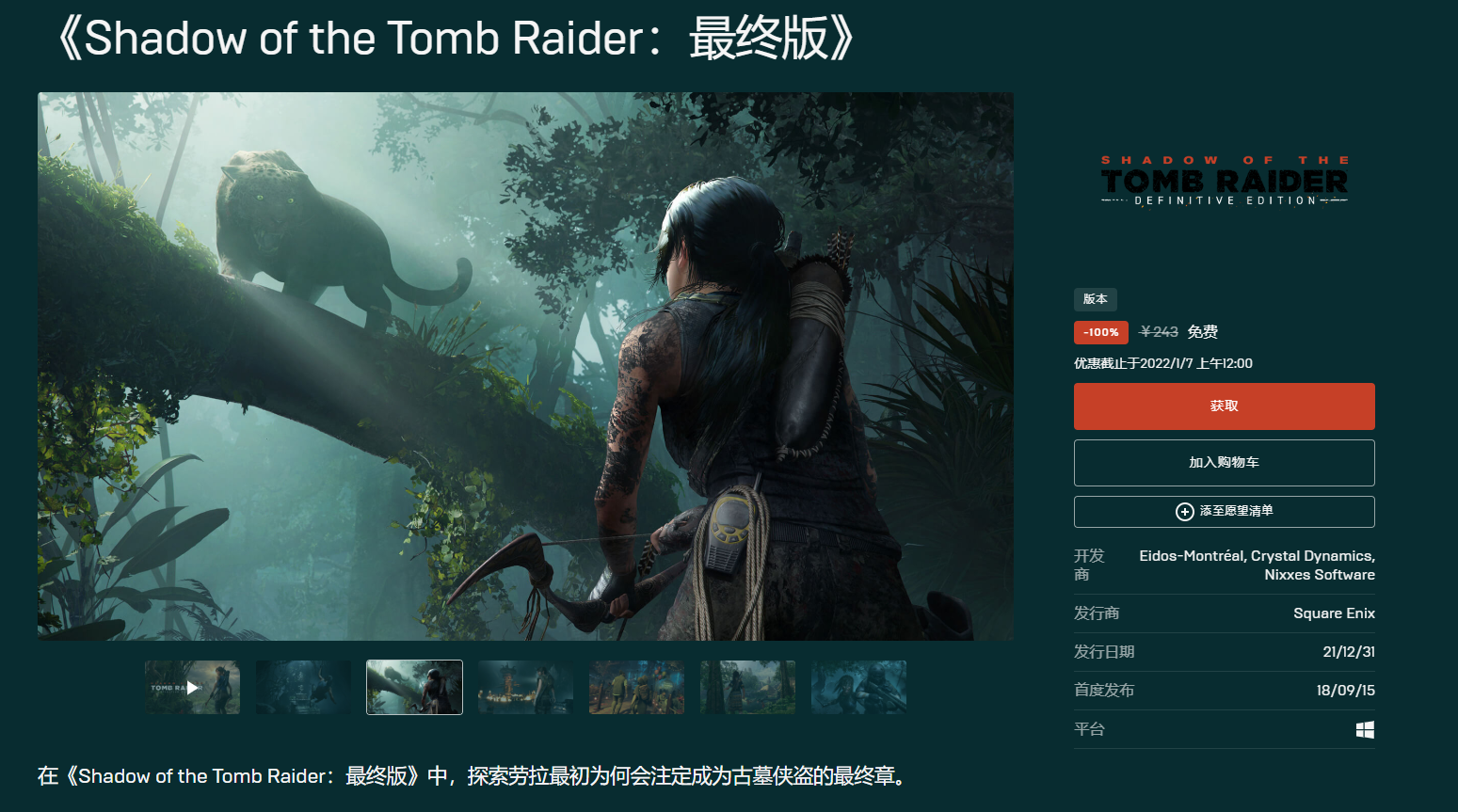 12月31日,Epic连续15天免费送游戏,今天是活动的最后一天,官方来了一波大的:《古墓丽影》三部曲免费领!《古墓丽影》生存者三部曲包含全部三部备受赞誉的前传游戏的最终版内容:《古墓丽影》最终版、《古墓丽影:崛起》20 周年纪念版和《古墓丽影:暗影》最终版,总价值468元。