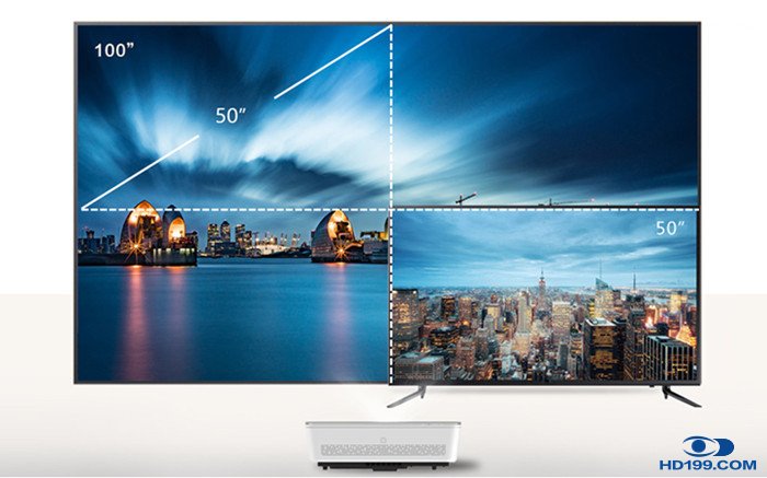 明基激光超投电视提供90吋、100吋和120吋3种大尺寸超薄抗光屏幕以及黑白两色主机,构成多种客厅大屏方案,灵活适应家居环境。由于轻盈的体型和易安装性,无需破坏主体墙壁安装,也一改常见的悬空挂架安装,剔除累赘配件,近乎与墙壁融为一体。0.233的投射比使得i950L尽可能贴近墙面摆放,不受电视柜宽窄影响;而普通家用短焦投影机需2.5米才能投100吋,不免太过占用空间。