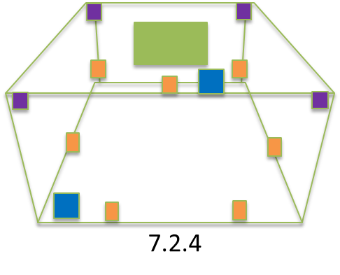 为了达到IMAX Enhanced最佳播放效果,IMAX Enhanced系统的推荐扬声器布局为7.2.4,即水平面有七个扬声器,两个低音炮和四个升高扬声器。