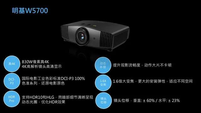 明基W5700是一台以广色域色准为主要卖点的4K家庭影院投影机,能达到DCI-P3色彩空间覆盖100%,在明基的一众4K家庭影院投影机里面算是灯泡机的旗舰机型了,